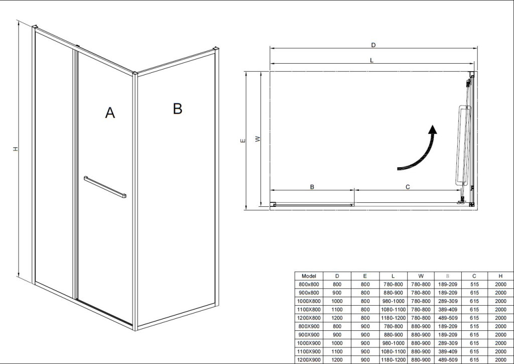 • Zuhanyajtó: 80, 90, 100, 110, 120 cm