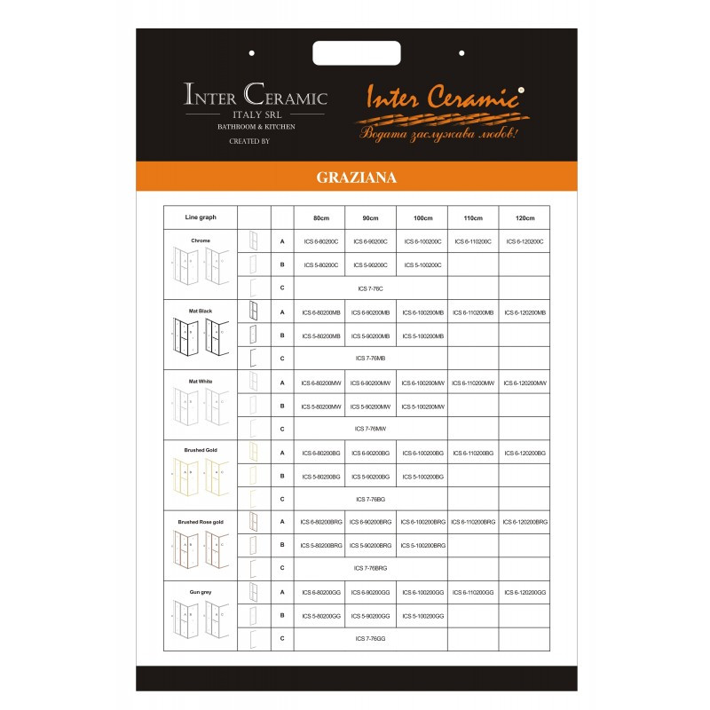 Ez a termék önmagában nem beszerelhető, de az IC-7-76BG fali rögzítő profillal beépíthető két fal közé zuhanyajtóként vagy oldalfallal (Pl.: IC-5-90200BG) való kombinálása esetén téglalap alakú zuhanykabin alakítható ki belőle.