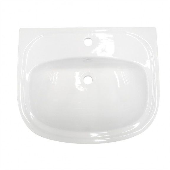 Fehér fali porcelán mosdó túlfolyóval és csaplyukkal. Méretei: 56x45x19 cm