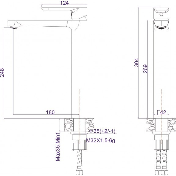 35 mm-es Sedal betétes SS304 magas mosdócsaptelep Brush Steel színben