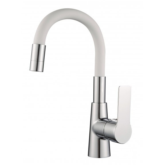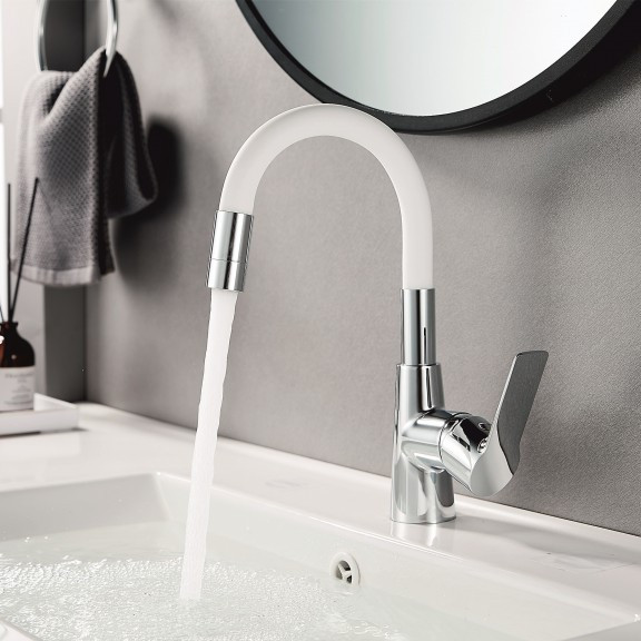 Egykaros króm mosdócsaptelep fehér szilikon kifolyóval, 35 mm-es Sedal kerámia betéttel, M24-es perlátorral, egy pár 3/8"x40 cm-es SS201 flexibilis csővel és rögzítőkészlettel