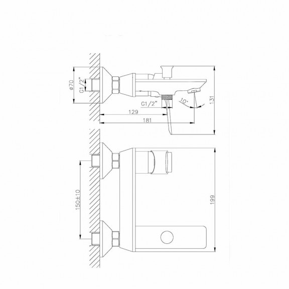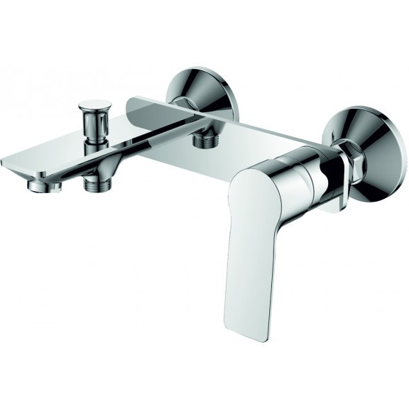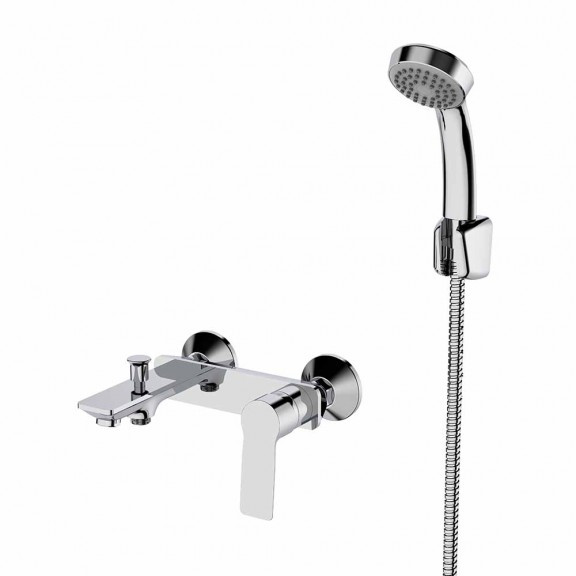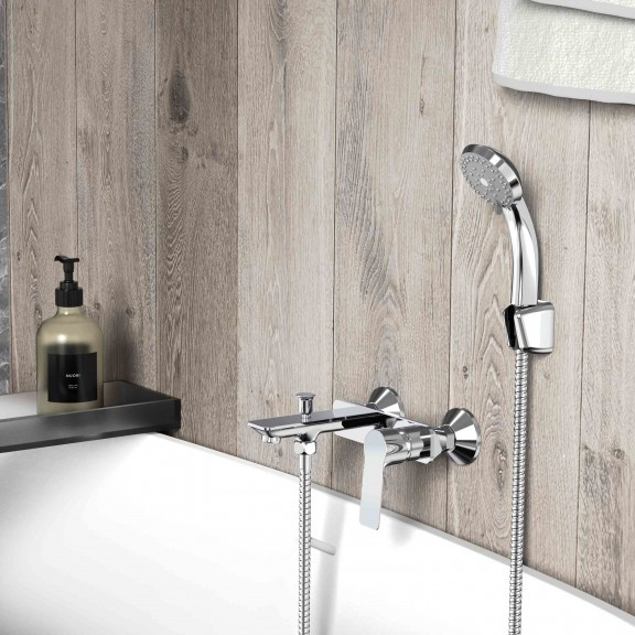 Krómozott sárgaréz csaptelep kerámia betéttel, ??? fogantyúval kádhoz és zuhanyzóhoz is alkalmas, gégecsővel és levehető kézizuhannyal, fali szereléshez.