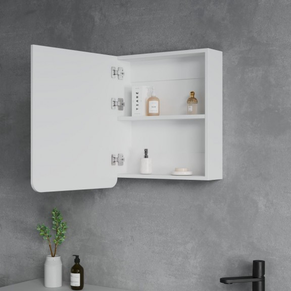 A szekrény belsejében egy polc található, ami segít rendszerezetten tárolni a mindennapi piperecikkeket. A soft-close zsanérok halk és finom ajtózáródást biztosítanak. A felső világítás nélküli kialakítás lehetőséget ad saját fényforrás hozzáadására.