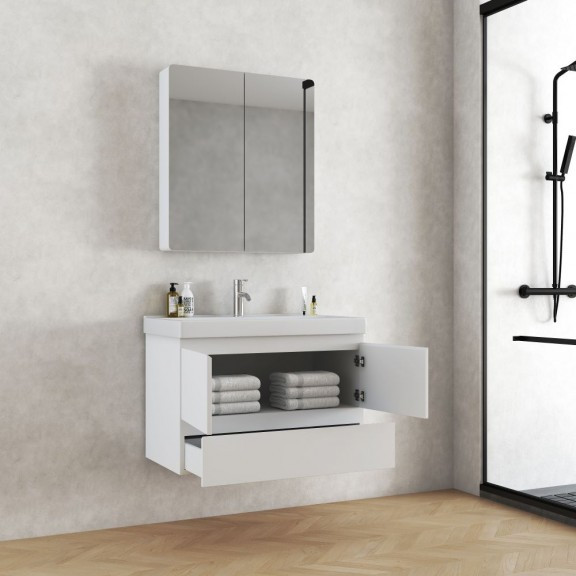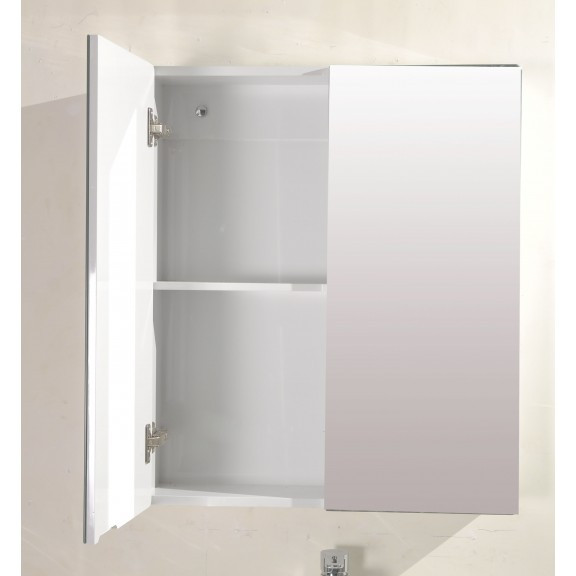 Az ICMC 7046 UP /7013 fürdőszobai tükrös szekrény letisztult, funkcionális formavilágával és fényes fehér felületével tökéletesen illeszkedik modern fürdőszobákba. A két tükrös ajtó mögött egy polc található, amely elegendő helyet biztosít a napi higiéniai és kozmetikai eszközök rendszerezett tárolásához.