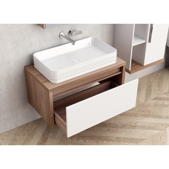A szekrény 80 cm széles, 40 cm magas és 45 cm mély, így ideális tárolóhelyet biztosít anélkül, hogy túl sok helyet foglalna el. Az egy darab tágas fiók halk, puha záródású DTC síneken fut, így a napi használat során is maximális kényelmet nyújt.