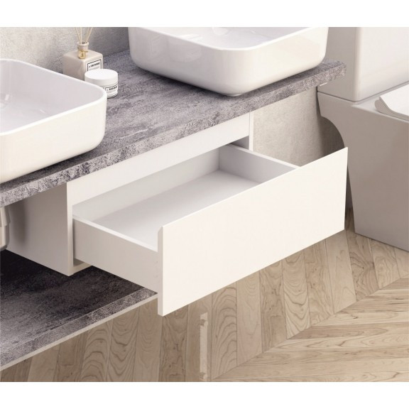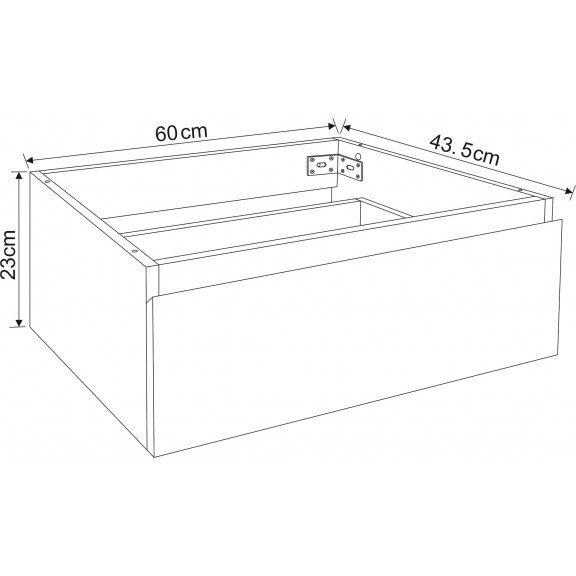A szekrény 60 cm széles, 23 cm magas és 43,5 cm mély, így tökéletes mindennapi fürdőszobai használatra. A beépített 1 fiók DTC síneken fut, halk és finom záródással, megkönnyítve a hozzáférést a tisztálkodószerekhez vagy kisebb kiegészítőkhöz.