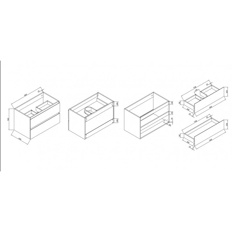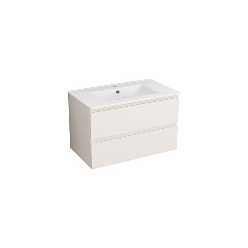 A két fiók csendes záródású DTC síneken fut, és push-to-open rendszerrel rendelkezik, amely egyszerre kényelmes és esztétikus megoldást kínál – fogantyúk nélkül, egyetlen nyomásra nyitható. A szekrényhez tartozik egy fehér, kerámia mosdó (8066 kódú), amely stílusos kiegészítője a modern fürdőszobáknak.